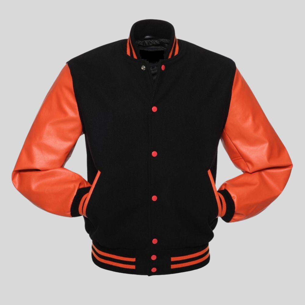 Black Letterman Jacket – Orange Faux Leather Sleeves