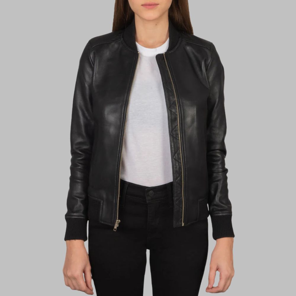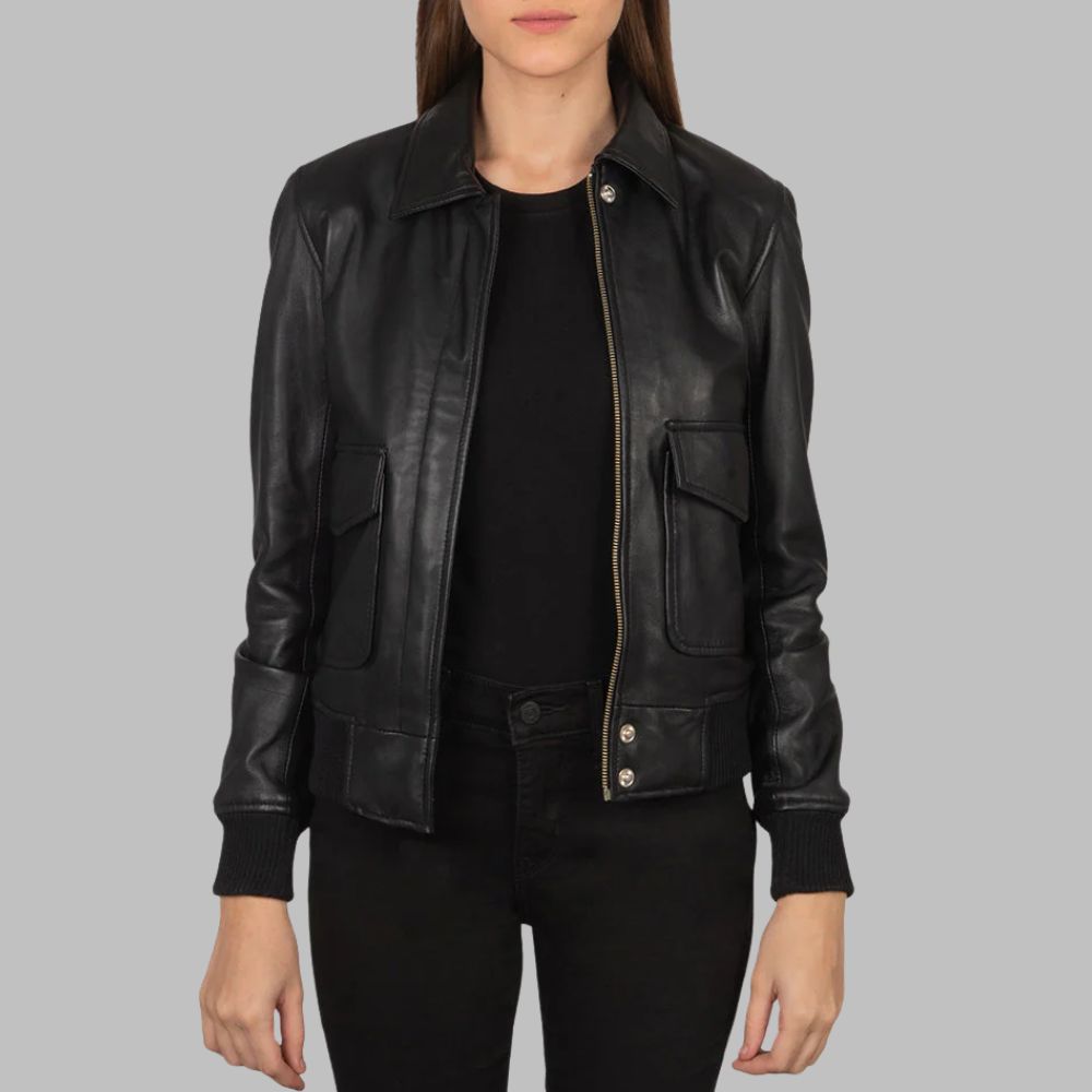 Women’s Black Sheepskin Leather Bomber Jacket with Button Flap & Rib Cuffs