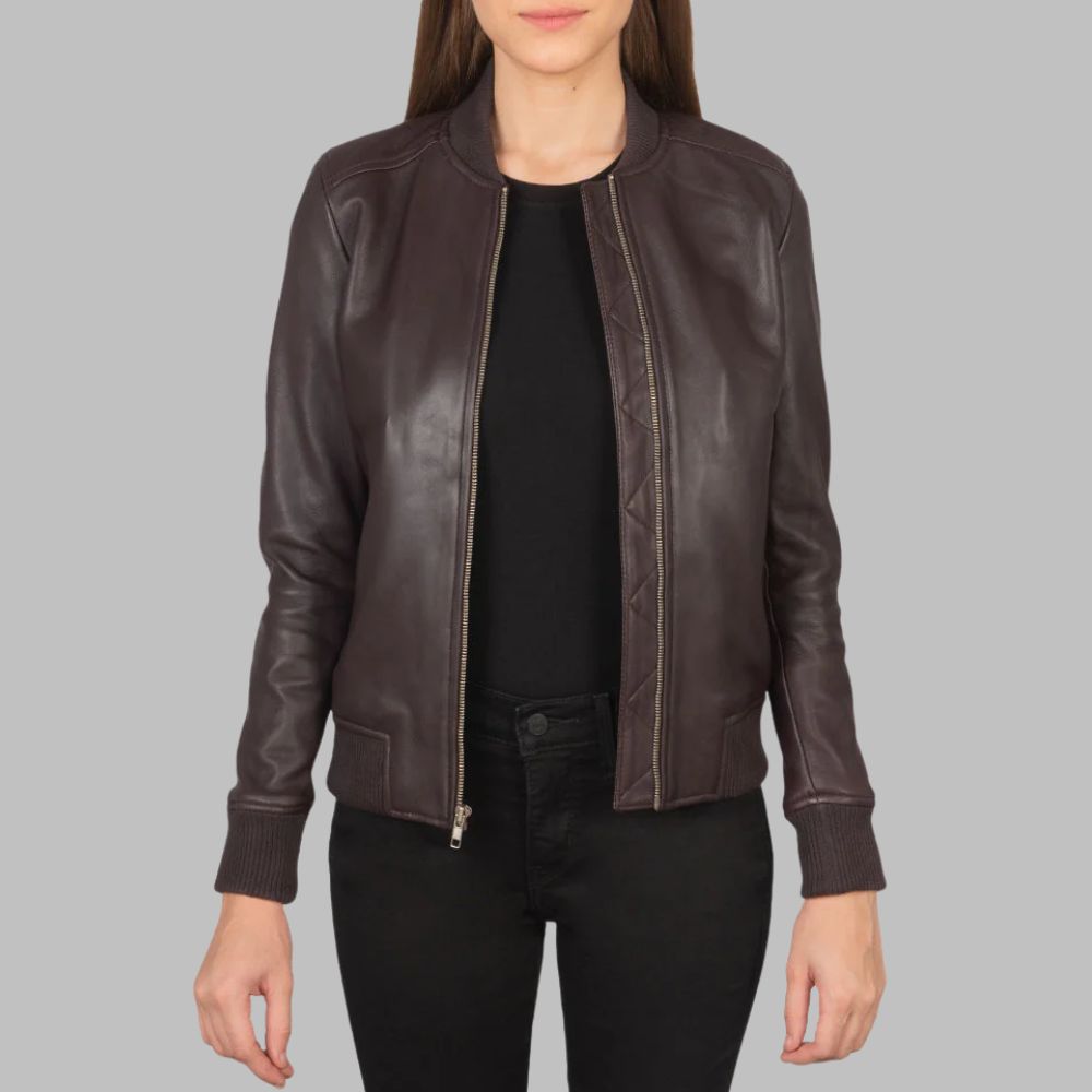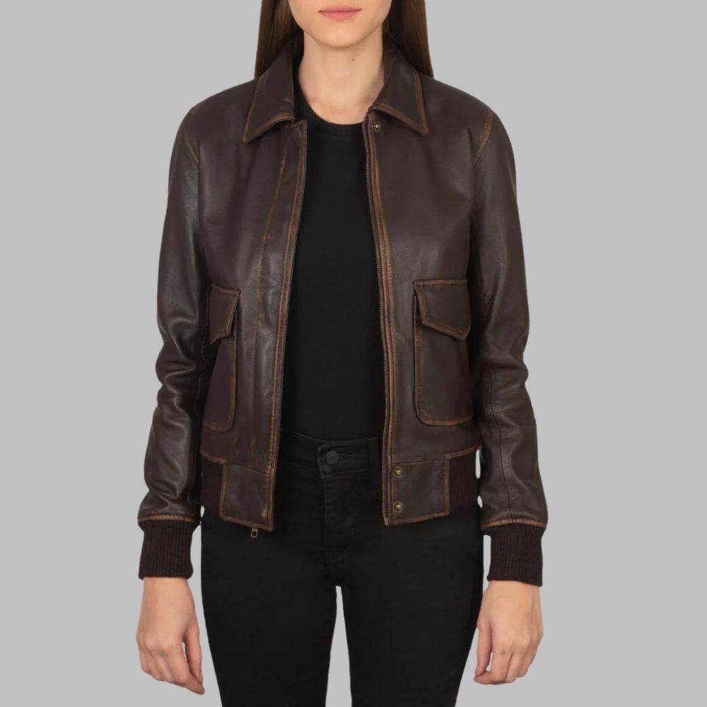 Women’s Brown Goatskin Rub-Off Leather Bomber Jacket with Button Flap
