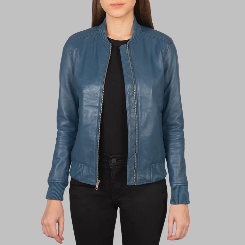 Women’s Blue Varsity Jacket – Real Sheepskin Leather with Wind Flap & Quilted Lining
