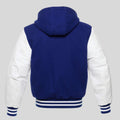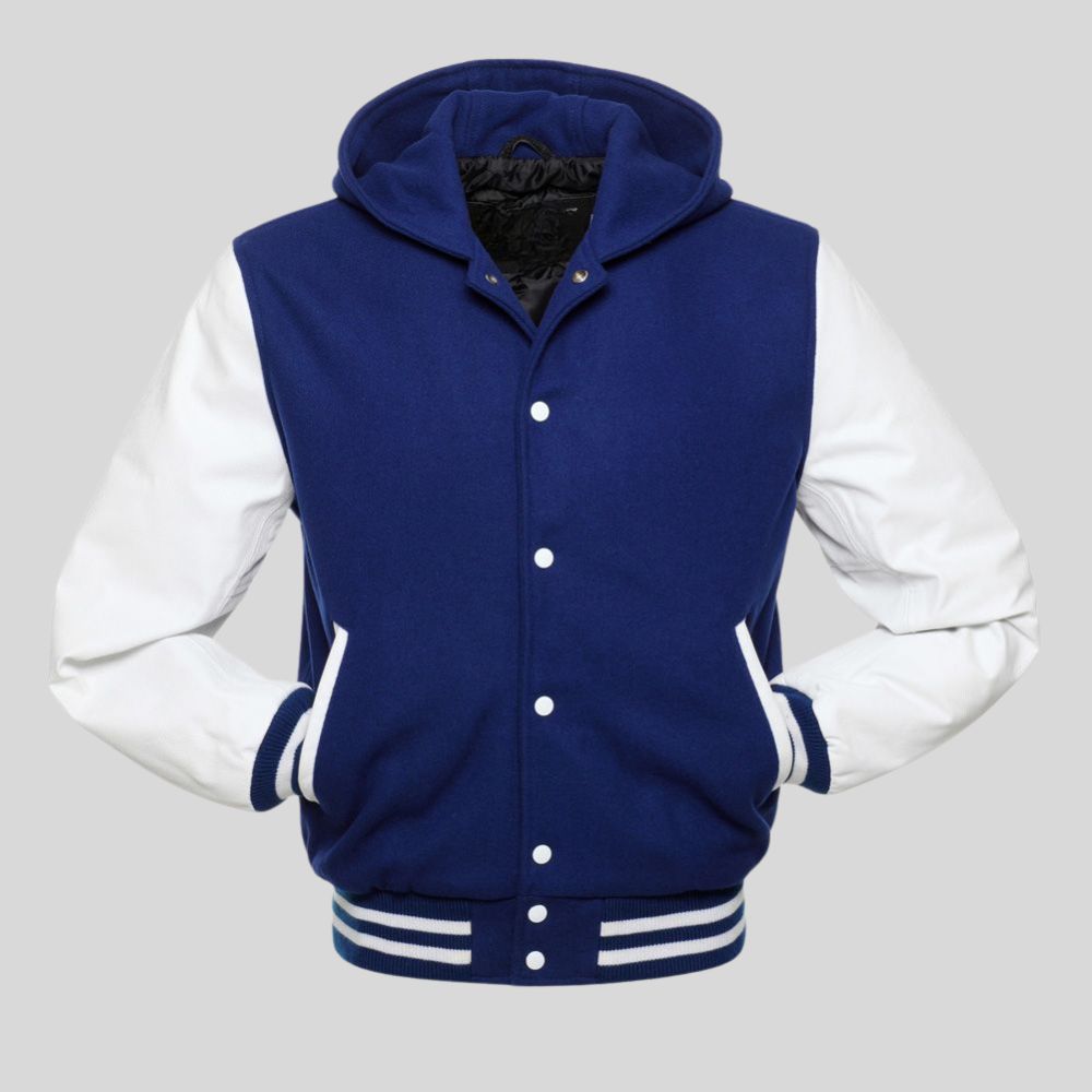 Men’s Varsity Jacket – Royal Blue Wool Body & White Leather Sleeves with Hood
