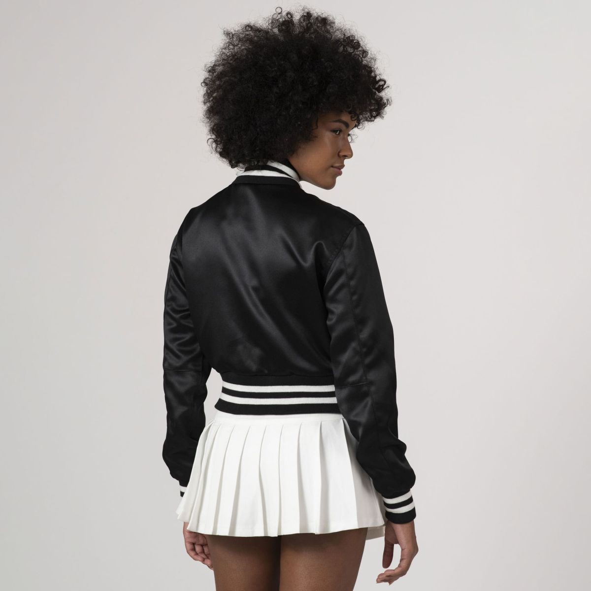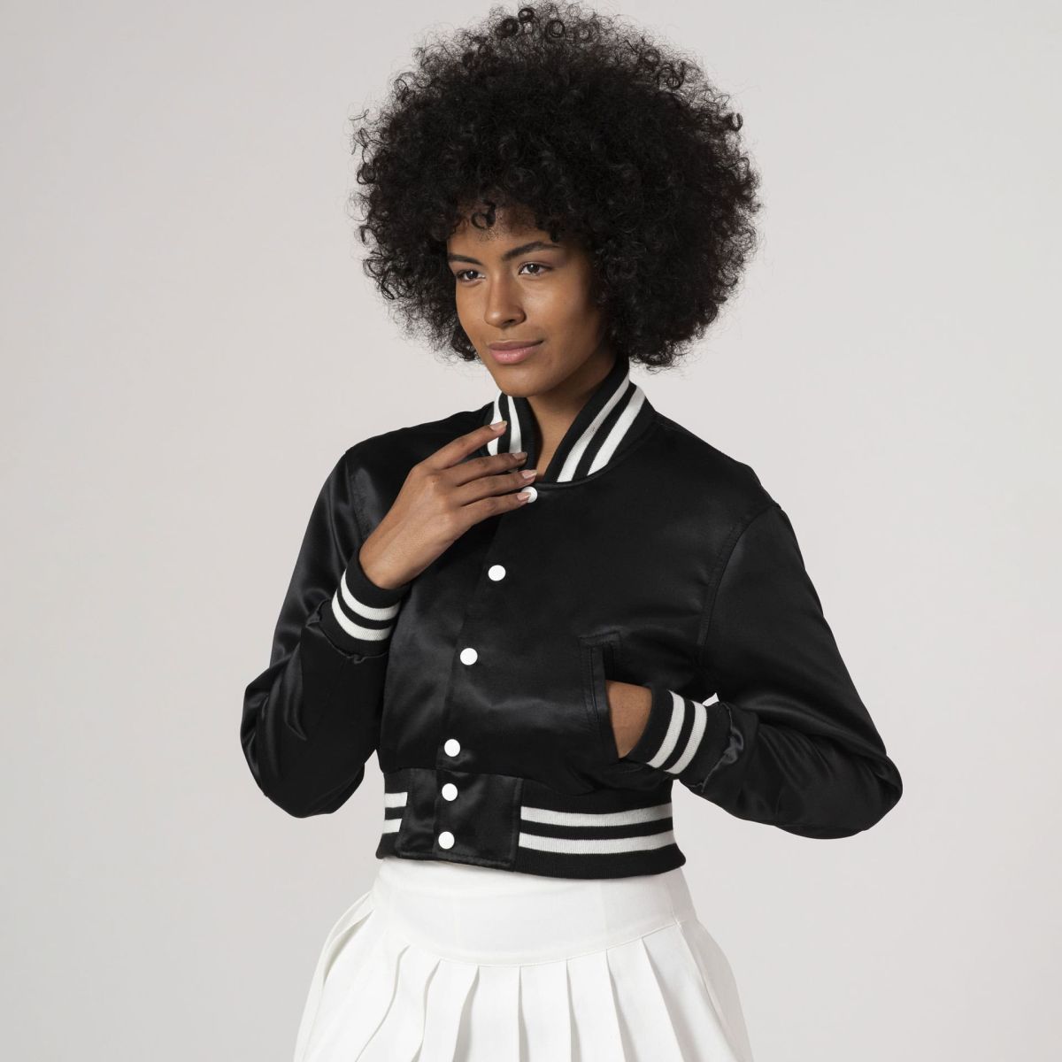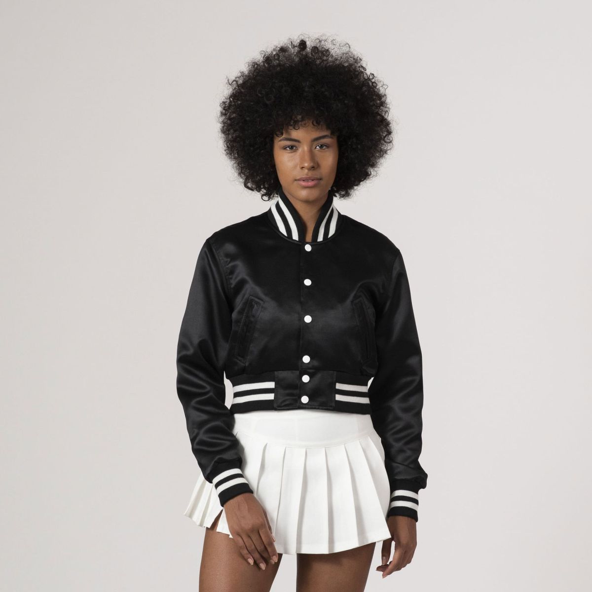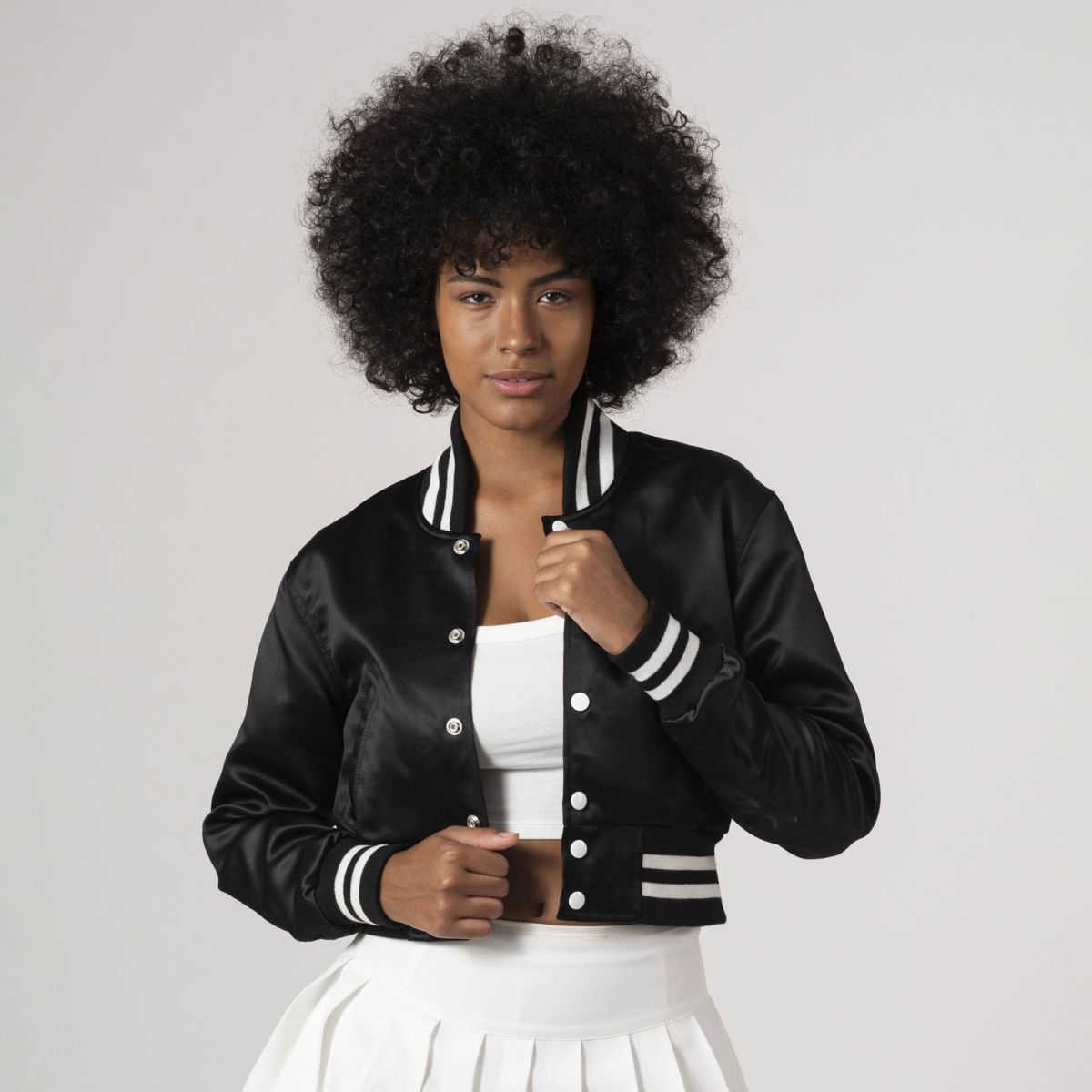 The Trendy Black Satin Crop Top Jacket is ideal for fashion-forward individuals who want to make a bold statement with a modern twist on the varsity style.