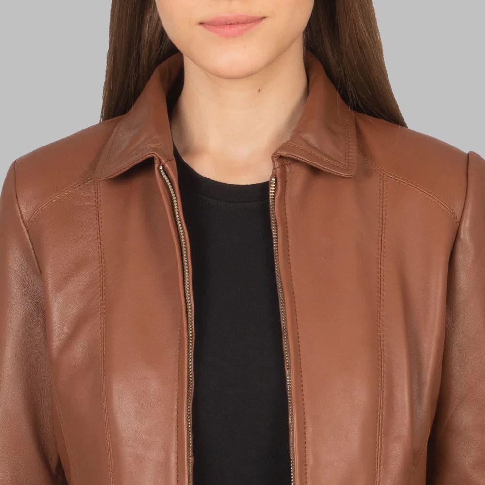 Women’s Brown Leather Jacket – Real Sheepskin with Shirt Collar & Zipper
