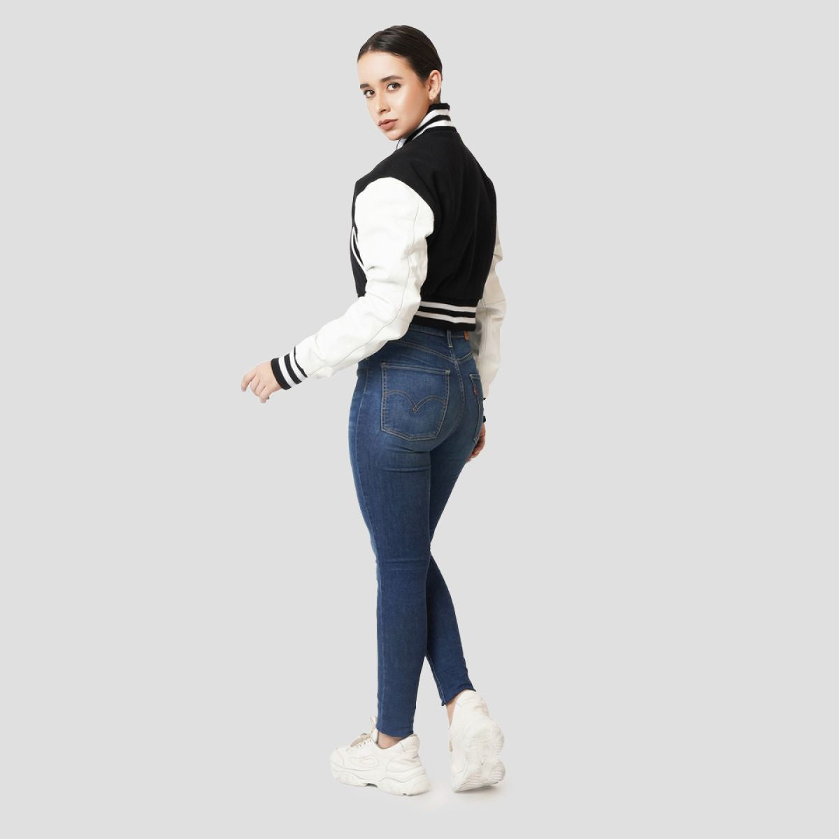 Women’s Cropped Varsity Jacket – Black Wool & White Leather Sleeves