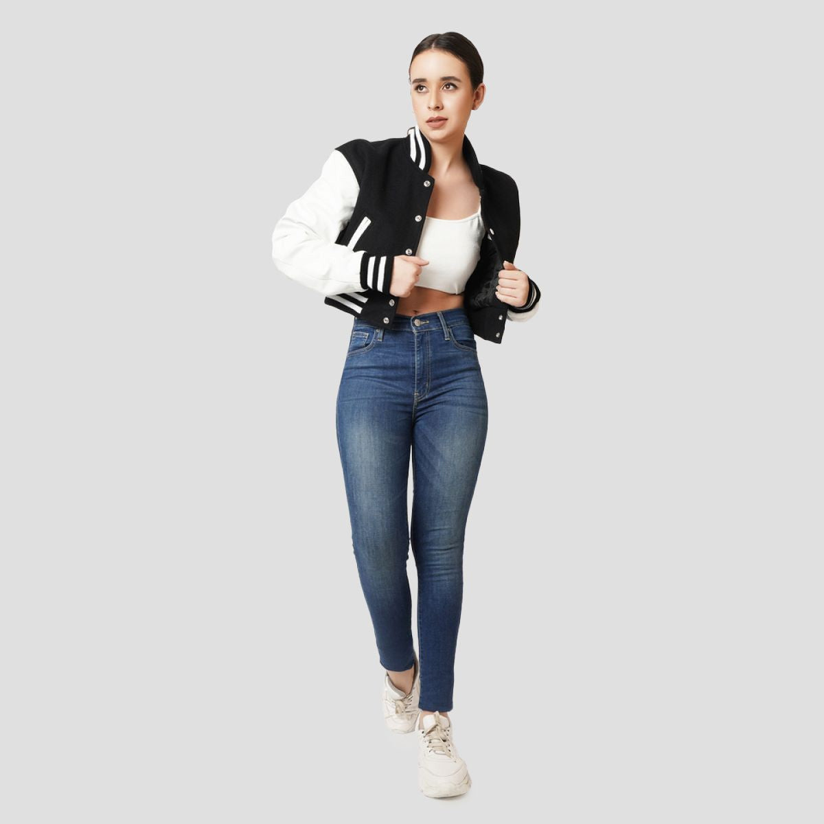 Step up your streetwear game with this Women’s Cropped Varsity Jacket — a perfect mix of sporty edge and feminine flair. Designed with a black wool body and white genuine leather sleeves, this cropped fit brings vintage varsity vibes with a modern silhouette.